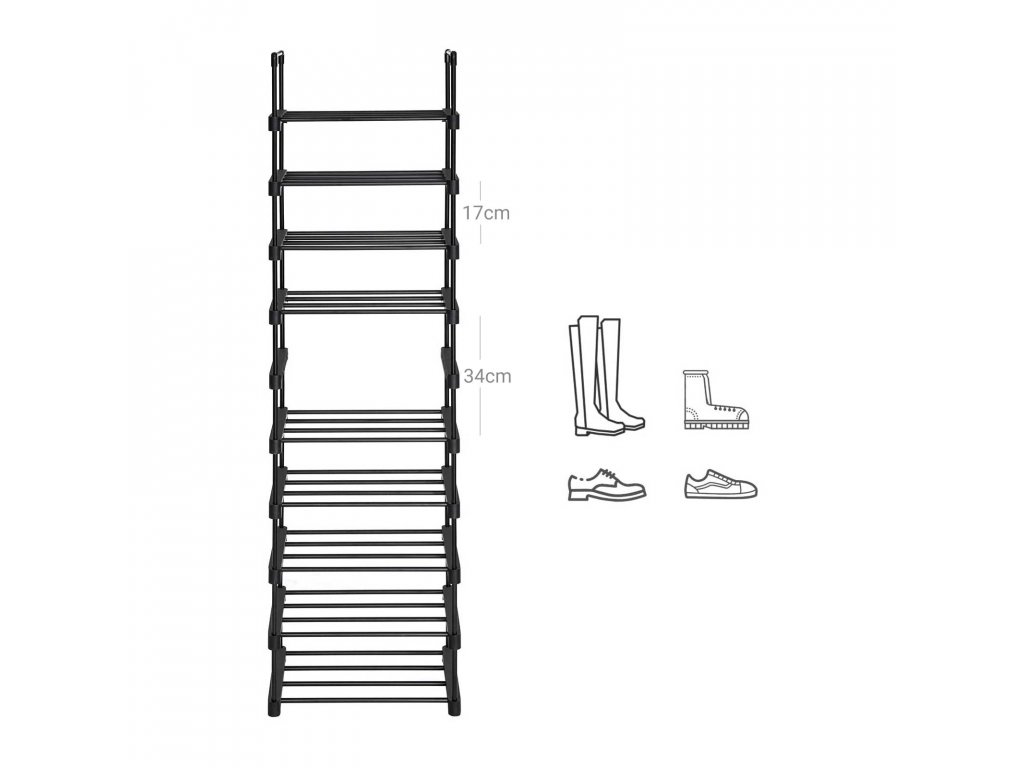 Kovový botník, stojan na boty, velký regál na boty, stojací police, úspora místa, multifunkční, černá.
