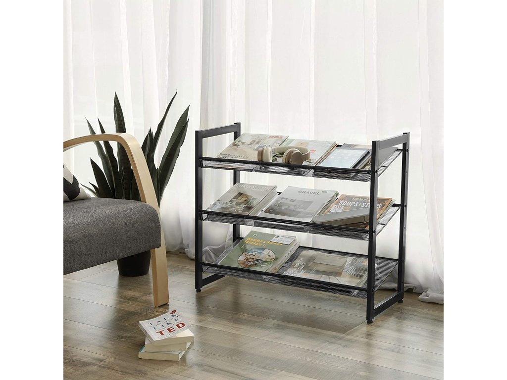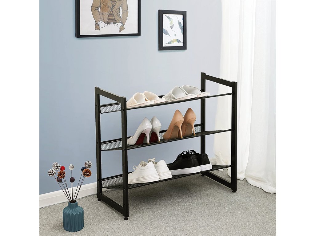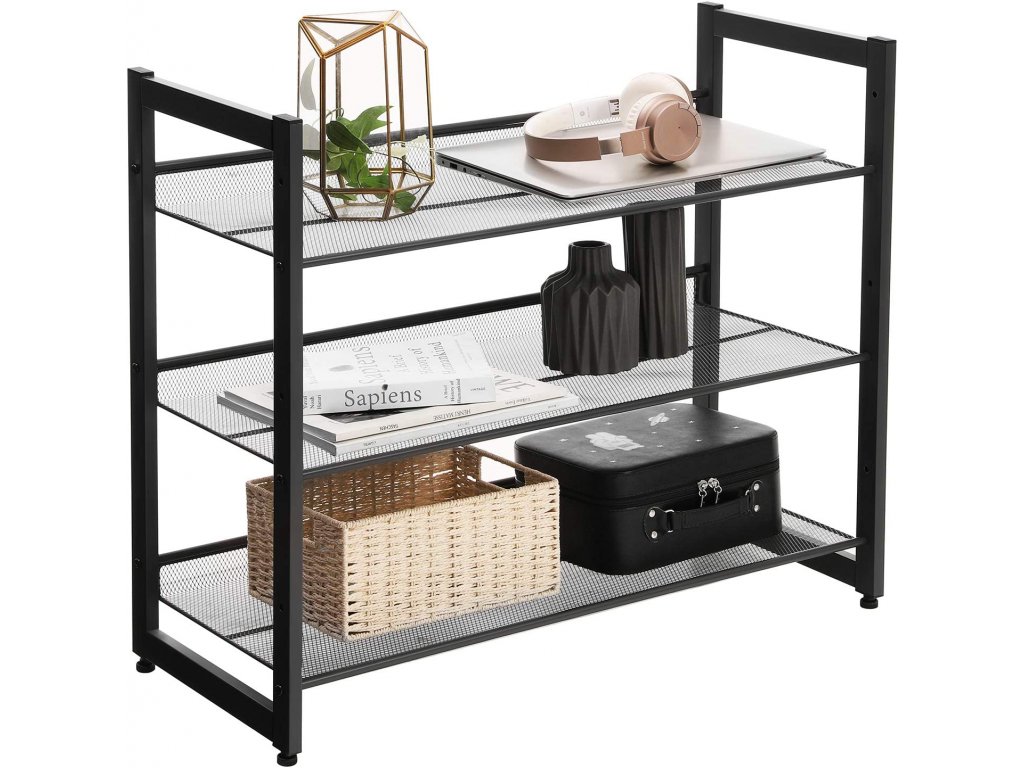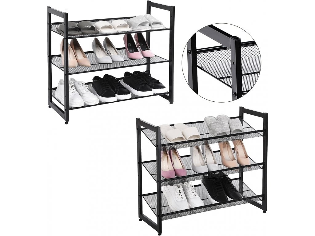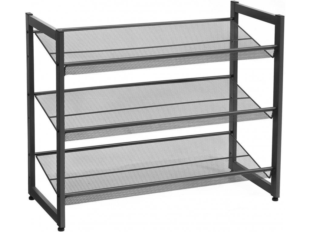 Kovový botník Tamara, černá Botník se třemi poličkami z kovové mřížky, nastavitelný botník, stohovatelný regál na boty, černá.