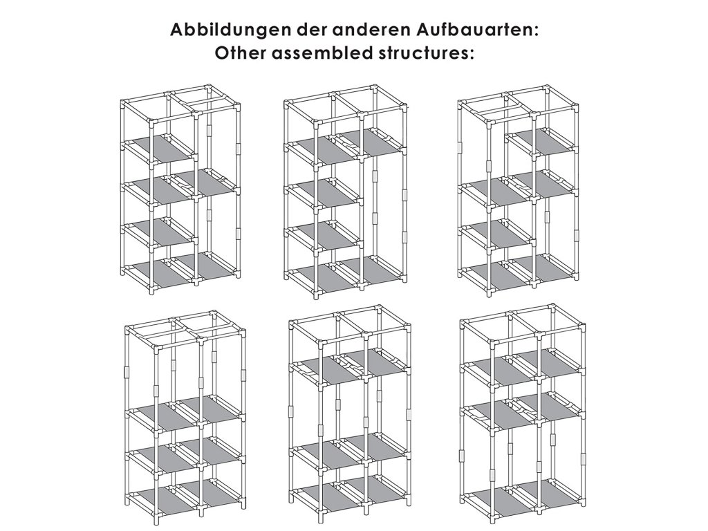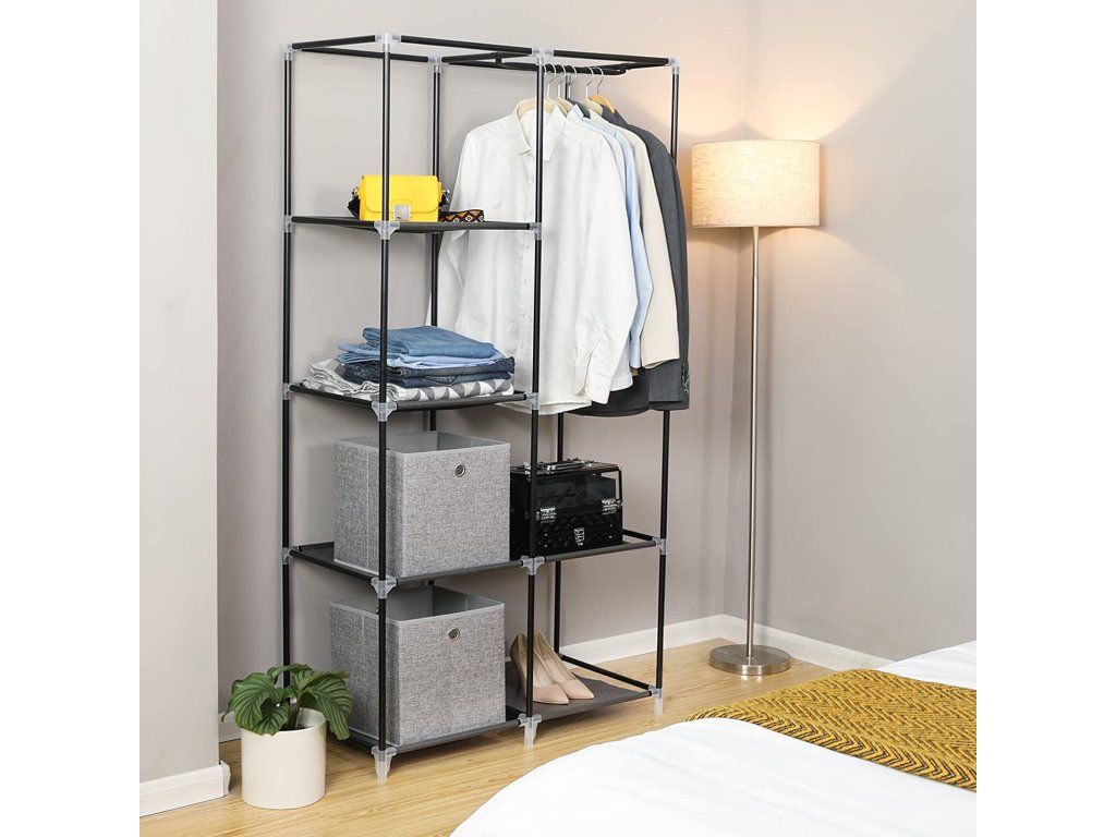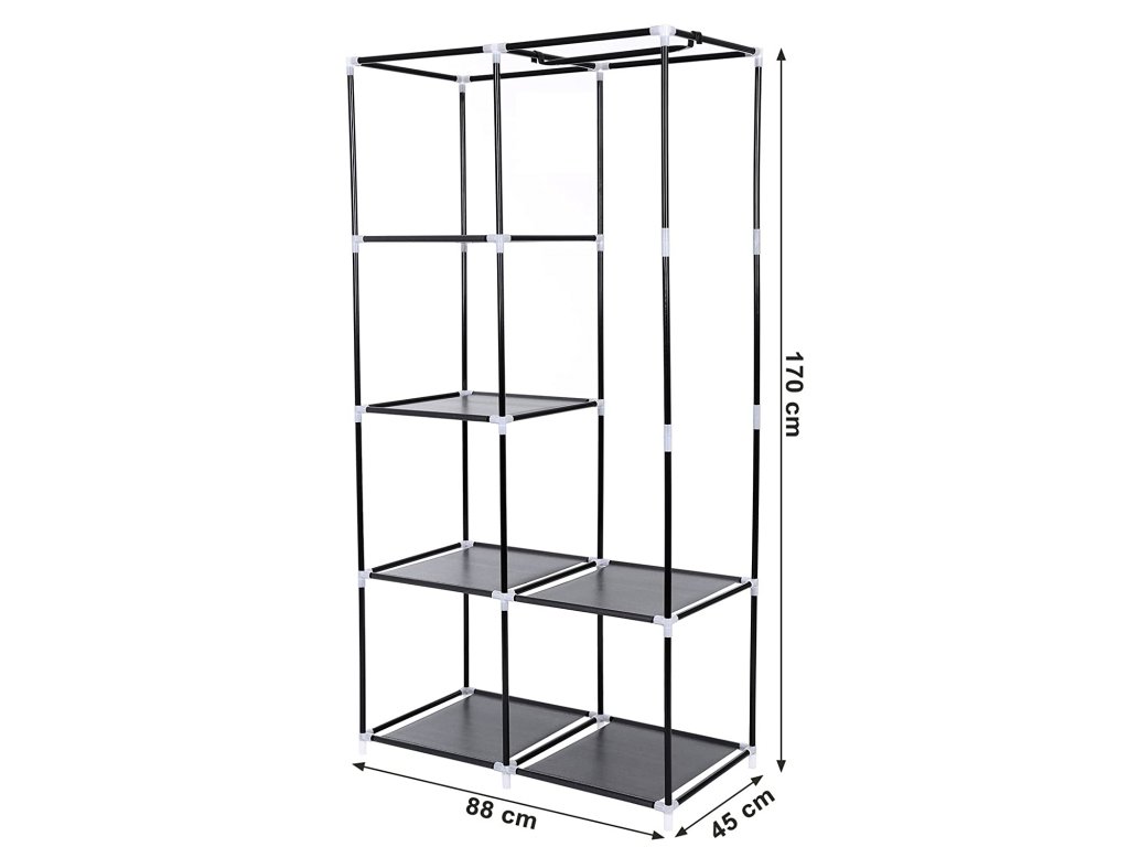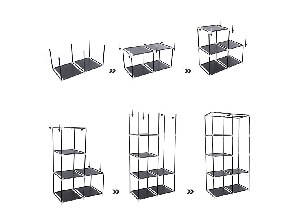 Design přizpůsobený zákazníkovi - všechny tyče na sestavení kostry mají stejnou délku, sestavení je tak jednoduché. 7 možností sestavení, přiložená i šatní tyč, ať už na pověšení šatů, kravat a šál nebo když chcete dovnitř vložit složené šaty, splnit lze každý Váš sen - vytváří praktickou možnost uložení věcí v ložnici, komoře, sklepě garáži atd.