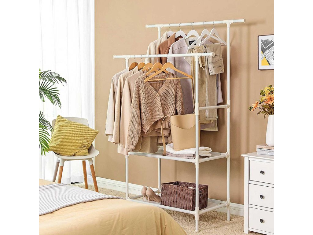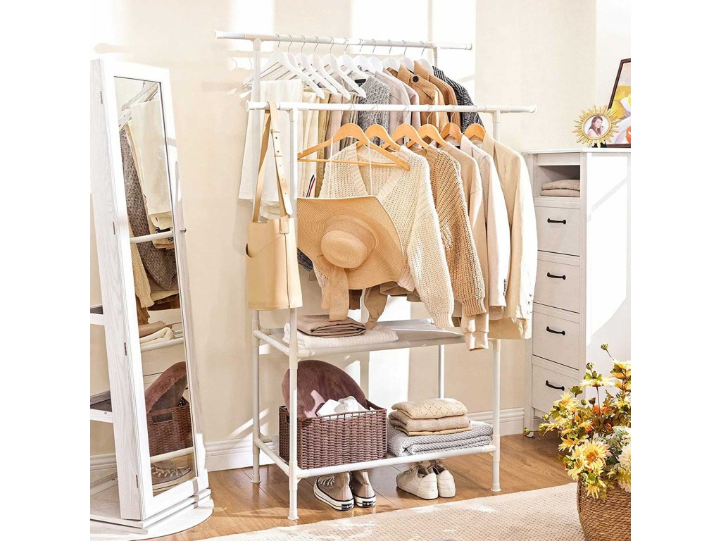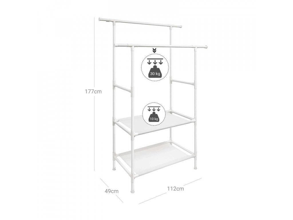 Kovový šatní stojan se 2 tyčemi na šaty, 2 policemi, nosnost až 70 kg, jednoduchá montáž, bílá.