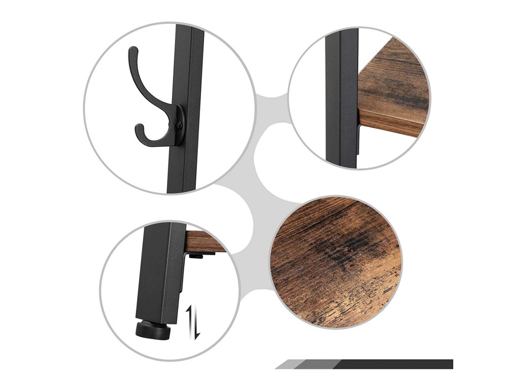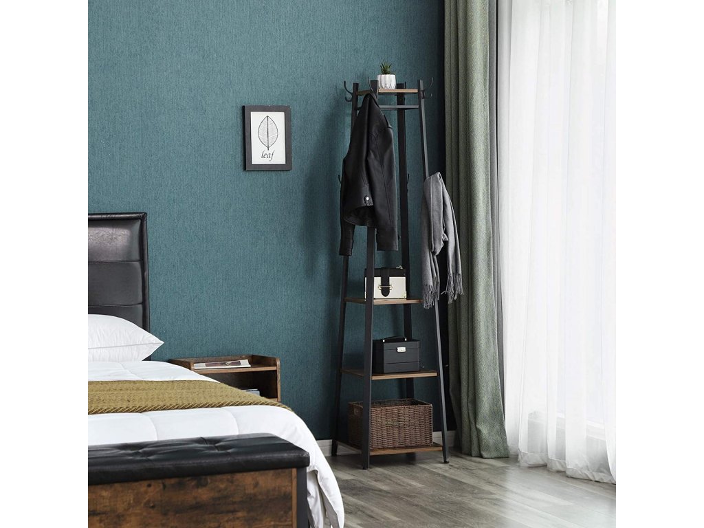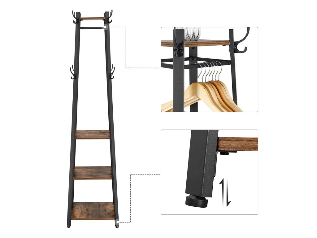 Šatní věšák Loren, černá Věšák na šaty se 3 přihrádkami, háčky, šatní tyčí a s kovovou konstrukcí, vzhled dřeva, industriální design, vintage hnědá, černá.