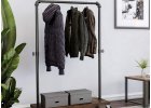 Věšák na šaty se 3 přihrádkami, háčky, šatní tyčí a s kovovou konstrukcí, vzhled dřeva, industriální design, vintage hnědá, černá.