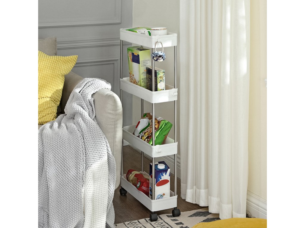 Jestliže je u vás doma vždy totální chaos, pak byste měli vyzkoušet tento vozík o velikosti 40 × 13,5 × 86 cm. Se 4 policemi vám pomůže řádně uložit všechny vaše koupelnové produkty, kuchyňské potřeby nebo kancelářské dokumenty .